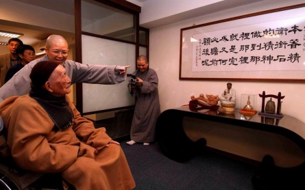 法師繼續推著輪椅前進,請導師看二樓左前方和室正中央的導師銅像(本院研究部同學葉瑞圻醫師贈);然後進入左後方的小參室,指著聖嚴法師墨寶,向導師說明:「88年學院落成之前,聖嚴長老告訴我:要送我一份賀禮,但先徵詢我的意見,看我要什麼禮物,我即向長老請墨寶。長老問我要題什麼內容,我就請長老寫下這段導師的話:『本著精衛啣石的精神,做到那裏,那裏就是完成,又何必瞻前顧後呢?』」講到這裡,法師幽默地請問:「您還記不記得這段話出自您的哪一本著作中呀?」導師正在思索,法師就接著說:「《說一切有部為主的論書與論師之研究》自序。」導師微笑頷首。