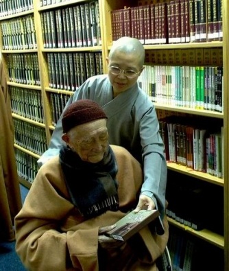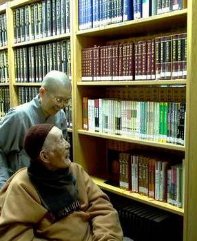 下到一樓,參觀圖書室時,導師仔細看書架與研究小間的擺設。法師又指著第一排的導師著作說:「您看,您的著作在專櫃的上面,我的在下面,擺書也要重視倫理的。」接著將今年九月剛出書的新版《成佛之道偈頌科判表》呈獻給導師,並介紹封面說:「這是性廣法師與空寂師聯合設計的。」為了避免導師坐在輪椅上行進時,手裡拿著書很不方便,法師本擬先代為拿書,要導師回寮房再翻閱它,但導師卻緊緊拿著不放。明聖法師笑道:「導師只要一拿到書,就會忘了其它,專注地閱讀起來!」導師聞言,笑了起來。大家見到他如此童心未泯的表情,不禁大笑。