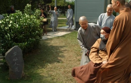 合影完畢,在鐘鼓聲中,全院師生列隊合掌,恭送導師上車、離院,昭慧、性廣法師與張章得、蘇滿足伉儷則陪同導師等一行,恭送導師返抵福嚴精舍。