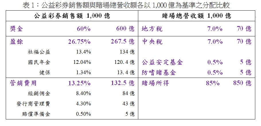 立法院交通委員會將行政院版之「觀光賭場管理條例草案」(博弈專法)排入了12/5日的審查議程,其內容之荒謬除了對「賭業豺團」友善到極點外,稅率還只有低到14%(地方7%、中央7%),加上公益安定基金0.5%、防嗜賭基金0.5%,意味著賭場總營收的85%送入業者的金庫,以下茲簡單地就「公益彩券」與「觀光賭場」的收入分配作個比較就可以明顯地看出其荒謬性,以彩券銷售額1,000億及賭場總營收額1,000億作估算。其中公益彩券銷售額的:管銷費用:132.5億(經銷佣金:84億,發行商管理費:43億,損失賠償準備金:5億)。其中賭場總營收的85%也就是850億進入「賭業豺團」荷包(見表1)。