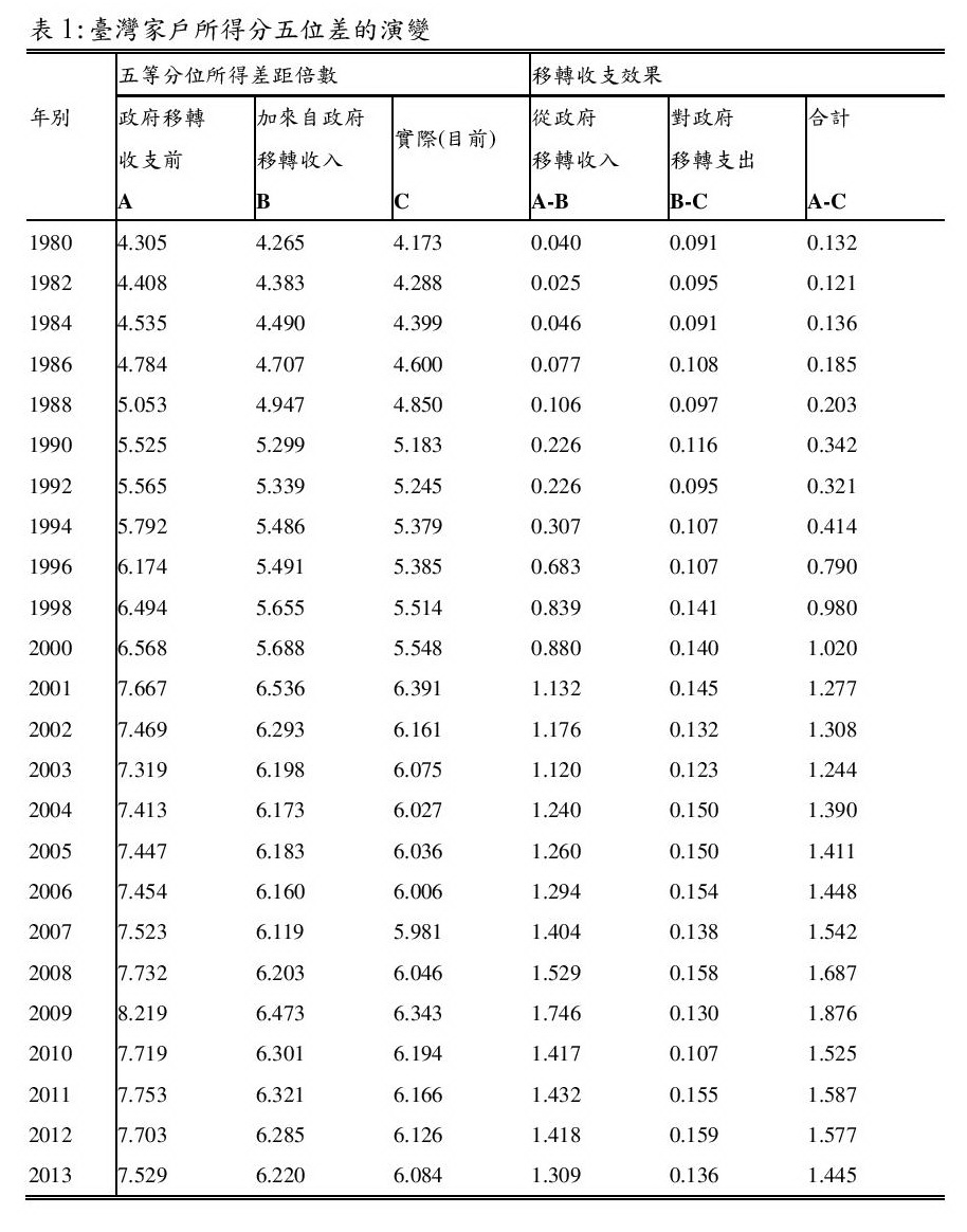 第五,再加上稅制不公。政府並沒有利用財稅手段縮小貧富差距。表1明顯指出這樣的困境。家戶從政府移轉的收入效果(社會福利、各種補助)從1988年起就超過家戶對政府的移轉支出(稅)所帶來的移轉收支效果。亦即,稅收作為縮小貧富差距的效果從1988起就被社會福利趕過。稅收效果一直不彰,且幾乎原地不動。表示我國的稅收並沒有達到預期的劫富濟貧效果。