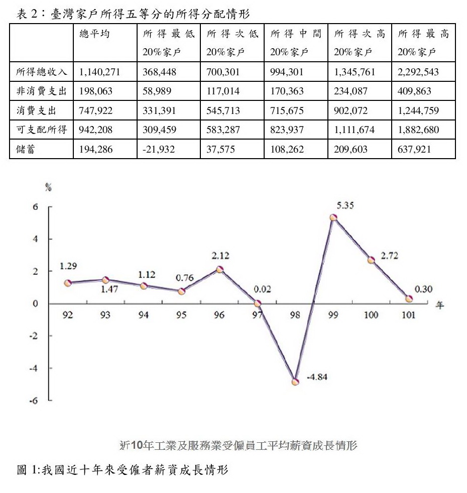其次,臺灣的勞工薪資偏低。以行政院主計處研究報告(2010)分析2009年5月,在638萬3千受僱者中,薪資低於15,000元者有22萬9千人,介於15,000-19,999元者有45萬8千人,合計68萬7千人,占受僱者的10.76%。41.72%的受僱者薪資不滿3萬元;58.9%的受僱者薪資不滿3萬5千元。顯示臺灣受僱者的薪資明顯偏低。
