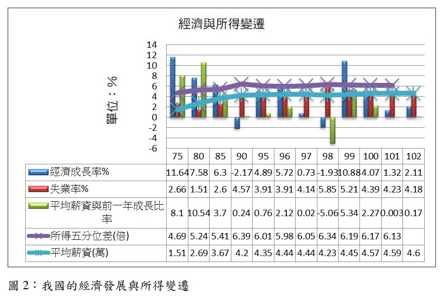 1980年代以來,臺灣從工業社會逐漸轉型到服務業社會,或說是進入後工業社會,貧富差距也跟著擴大,所得五分位差從1980年的4.17倍,逐漸爬升到1990年的5.18倍。1990年代末,又受到新自由主義全球化的波及,貧富差距再擴大,所得五分位差逼近5.5倍。接著,經歷2001年網路泡沫化、2008年的全球金融風暴,對臺灣的經濟與社會造成前所未有的打擊,經濟發展負成長、失業率升高、貧富差距擴大,都創下臺灣工業化以來的歷史新高。雖然,經濟成長率緩緩復甦,失業率也些微下降。但是,貧富差距縮小有限。臺灣其實早已進入經濟成長的結構限制,未能於經濟高度發展的1970-80年代,同步進行分配社會化的結構佈局,導致錯失成為均富社會的時機。