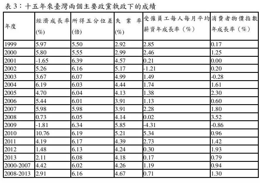 遺憾的是,在解決這種後工業化與全球化帶的貧富差距擴大問題,自稱有五十年執政經驗,又熟悉經濟發展議題的國民黨政府,卻在2000年首度失去政權後,在2008年再次執政,卻表現得比執政新手的民進黨來得差。從表3可以看出國民黨再度執政的7年裡,平均經濟成長率只有2.91%,比民進黨執政八年的4.42%低;所得五分位差6.16倍,比民進黨執政時期的平均6.02倍高;失業率4.67%,比民進黨執政時期平均4.26%高;受僱者平均薪資成長率0.71%,也比民進黨執政時期平均1.19%低;消費者物價指數等指標年成長率1.30%,也比民進黨執政時平均0.94%高。無怪乎人民覺得不但經濟環境差,貧富差距也更惡化。