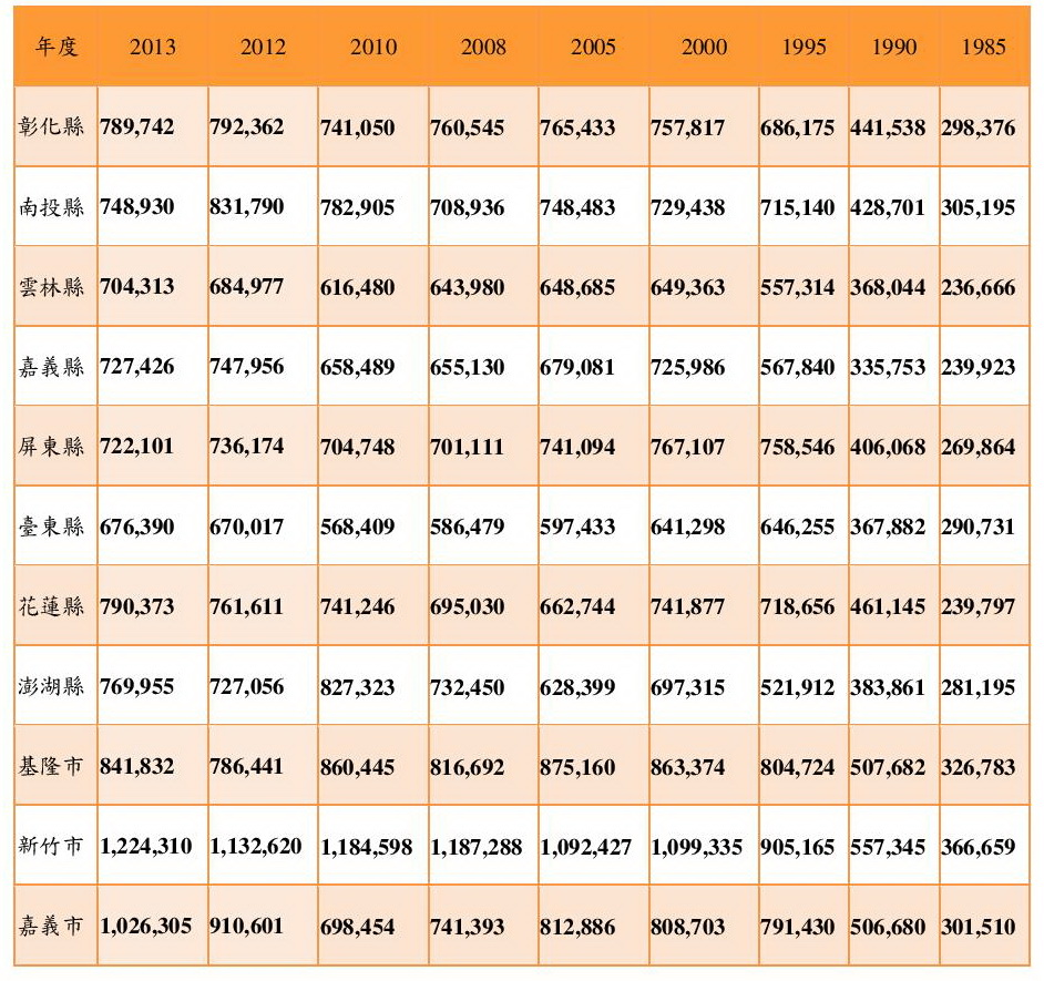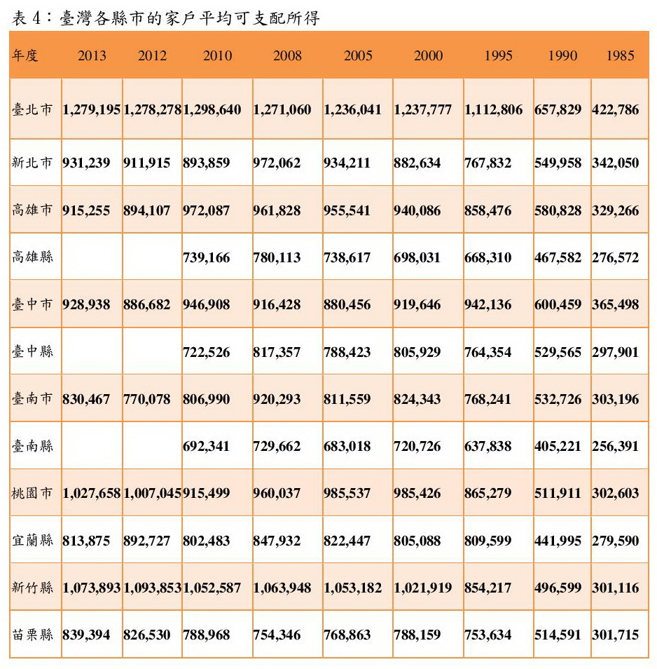 這種因產業結構導致的城鄉差距,如果沒有靠中央政府的政策介入,很難改變。居住在農漁業縣分的居民,就無奈地必須接受較低的生活品質,這是區域不正義。民進黨執政時期曾推出投資中南部、中小企業、中下階層的三中策略,些微扭轉南部縣市居民的困境。從表4可看出,雲嘉南高屏等縣市的家戶平均可支配所得在民進黨執政時期,有稍微提高,到了2008年以後,才又下滑。無怪乎南部農業縣分一直都是民進黨執政的瓤中物。