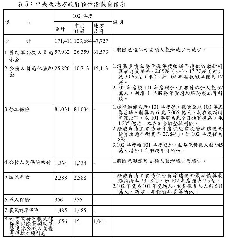 此外,依行政院主計處統計102年底的統計,我國潛藏性債務高達17兆1411億,其中中央政府12兆3,684億元、地方政府4兆7,727億元。包括:舊制軍公教人員退休撫卹基金缺口5兆7932億,公務人員退休撫卹新制2兆5826億,勞工保險基金潛藏債務8兆1034億元等最為龐大。(詳見表5)雖然,屬於隨收隨付制(pay-as- you- go)的勞工保險與國民年金保險基金潛藏債務可能被高估。但是,仍說明我國政府的潛藏性債務龐大。這些都是下一個世代的國民要承擔的。亦即,國民黨政府執政超過50年,用超高的退休撫卹給付來籠絡軍公教人員;而民進黨接手執政8年又礙於立法院掌控在國民黨手上,加上來自軍公教系統的壓力,致不敢大刀闊斧改革。結果是下個世代概括承受。這就是世代不正義。無怪乎年輕人也站出來反對現在的政府。