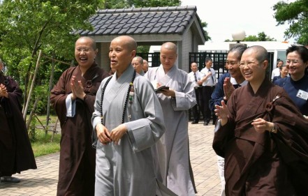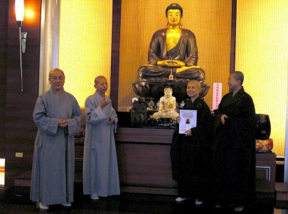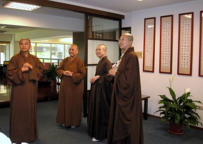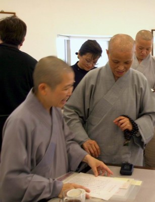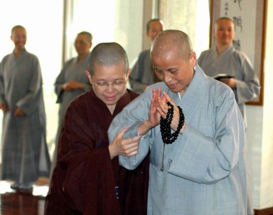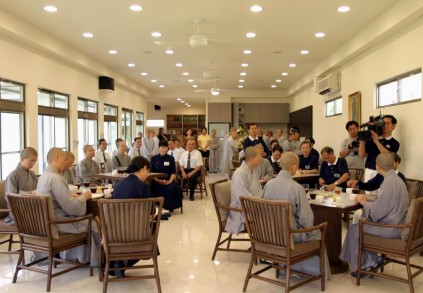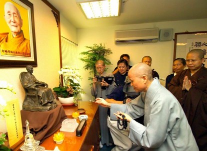 94.6.20 證嚴法師謙不肯到正中間的住持拜墊,而準備就地禮佛,昭慧法師只好強牽上人就住持位,並向她說:「您是我們心目中景仰的大德、敬愛的大姊,怎麼可以不就此位?」