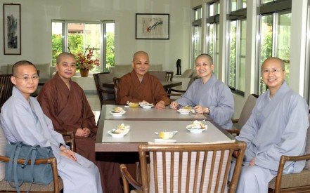 93.6.25 妙雲蘭若住持慧理法師(左三)、監院常光法師(左二)在德杰法師(左一)陪同下蒞院,在嵐園茶敘。