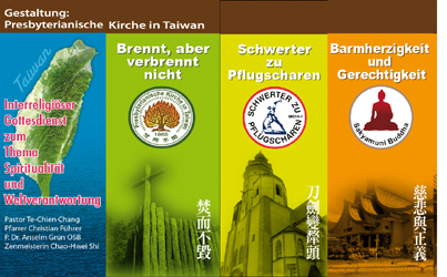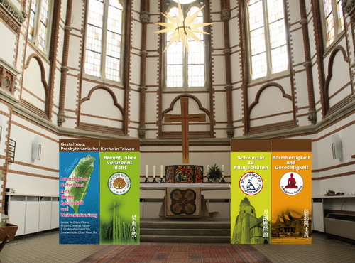 台灣基督長老教會預先已作好會場佈置的規畫(左起:右邊看板代表佛教的圖像)。