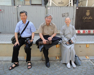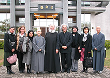 2008年德國古倫神父在東門教會盧俊義牧師陪同下,蒞臨弘誓學院,於法印樓前合影留念。(左起:許淑英牧師娘、德國四塔出版社版權主任威博斯女士、南與北文化出版社主編吳信如小姐(德文翻譯)、昭慧法師、古倫神父、盧俊義牧師、盧牧師令嬡悅文、范瑞薇、性廣法師)