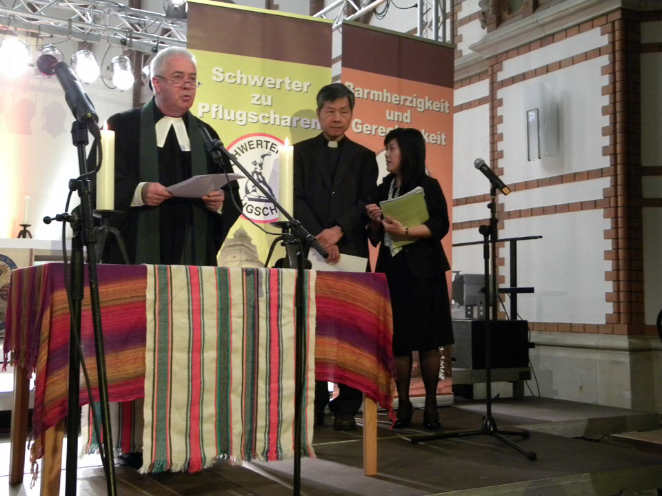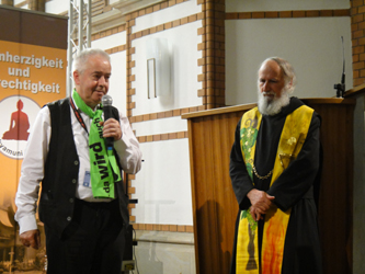 這場禮拜的主持人,是曾留德且嫻熟德語的王貞文牧師。其中的宗教對談有兩大主題。一個主題是「宗教對話與合作」,探討的內容是:「以靈修的基礎,共同承擔世界責任,關懷人們的心靈需求」,由代表天主教的古倫神父與代表佛教的我作雙向對談;另一主題則是「『教會、民主與社會公義』的實務經驗分享」,以「從台灣基督長老教會與前東德教會的經驗,來思考教會應如何成為受壓迫者的堡壘、這個世界的鹽?」以及「普世宣教應如何與人權、公義與和平緊密連結?」兩個面向為對談內容,由PCT總幹事張德謙牧師及富勒牧師進行對談。