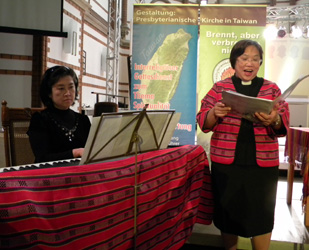 擔任司禮的王貞文牧師(右)身著原住民服,蕭珮芬牧師娘擔任司琴(左)。(100.6.2)