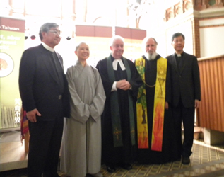禮拜結束後於台上合影。(100.6.2,左起石連城牧師、昭慧法師、富勒牧師、古倫神父、張德謙牧師)
