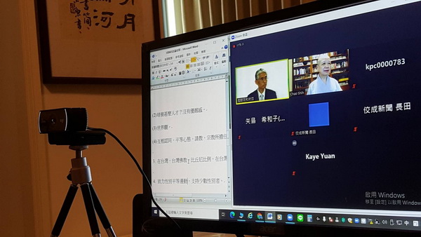 下午有一場日本佼成新聞社舉辦的跨國Zoom視訊訪談,由庭野基金會理事長庭野浩士博士(Dr. Hiroshi Munehiro Niwano)對我展開一系列訪談。在座還有《佼成新聞》主編長田先生(Mr. Osada)、擔任中、日口譯的矢島希和子女士(Ms. Yajima Kiwako),以及這兩個多月以來,陪同我配合庭野基金會,進行頒獎典禮及媒體訪談等系列活動之相關籌備工作的重要夥伴--專業口譯員袁筱晴居士。