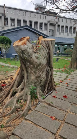 回到學院,看到這棵盤踞後院的大榕樹,被鋸到只剩一公尺許的樹幹,不免深有觸動。