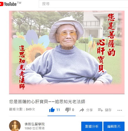 「請看我為出家母親請人剪輯並配樂的追思影片:https://www.youtube.com/watch?v=8iOI4JE2nVs。」(知光師公追思影片由廖崇仁居士發心致作,其中的照片是我選輯的,旁白也是我撰寫的。)