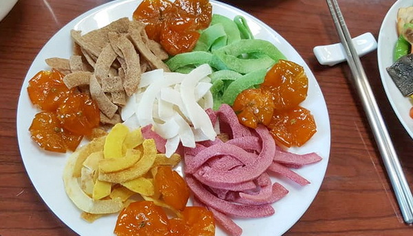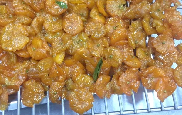 前幾天她買來一顆顆椰子,刮出椰肉,切成一條條的,分別浸泡甜菜根、咖哩、咖啡、鮮奶、香蘭,而做成紅、黃、褐、白、綠五色的零食,再把庭園裡的金棗摘下,製成蜜餞,拿來作為新年待客的茶點。