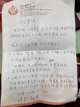 老人於去年3月20日預立如上遺囑。原因是,徒弟給他看些照片,那是前一天(3月19日)一位教界長老追思讚頌會的盛大場面。
