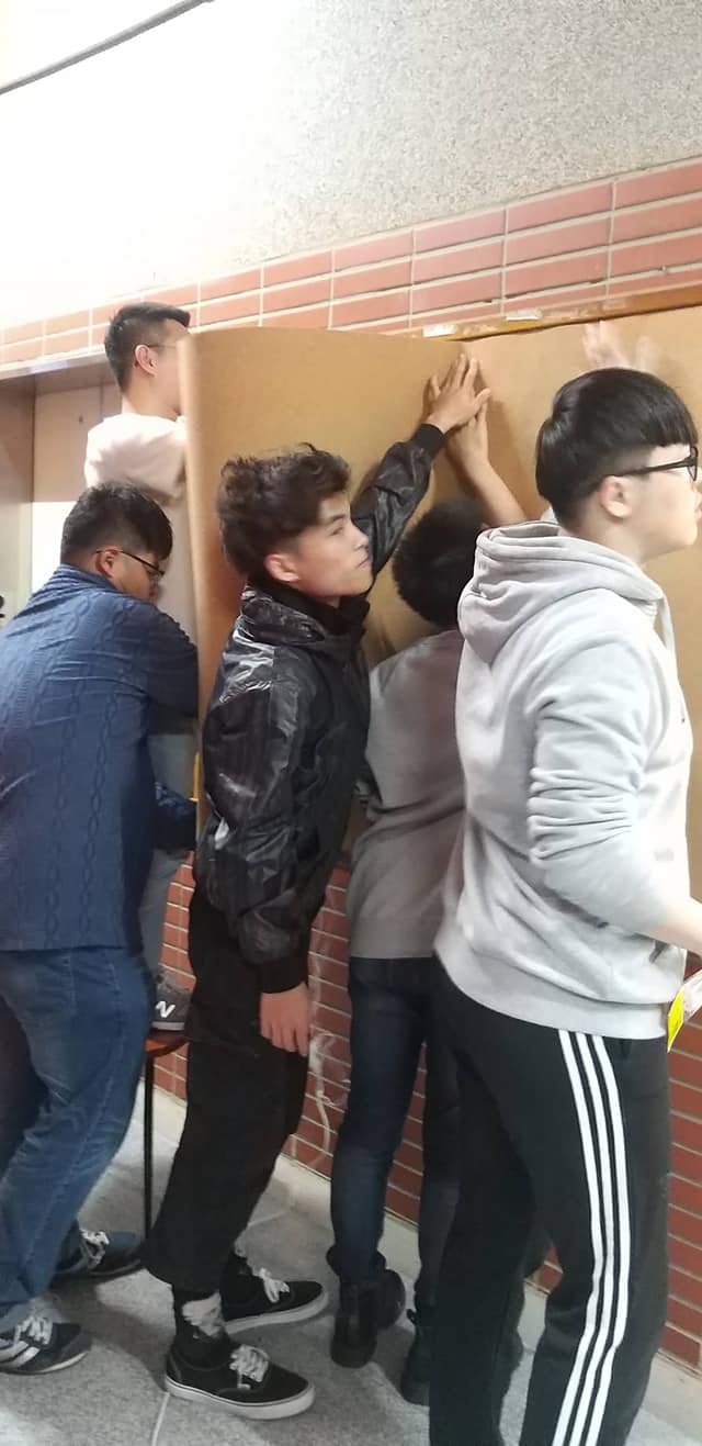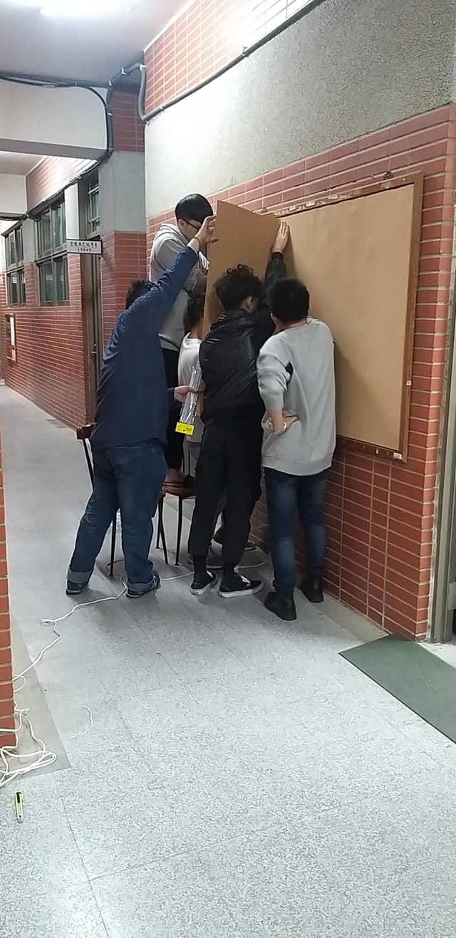 他們首先刷洗創客中心外面的2個大佈告欄,接著貼好6個小佈告欄+2個大佈告欄的軟木墊。佳慧來訊告知: