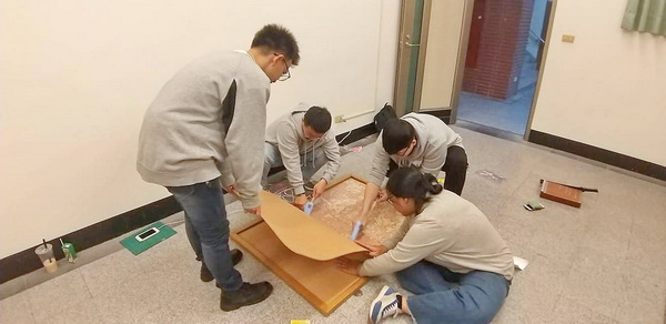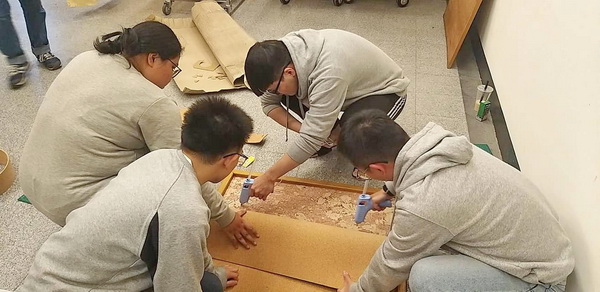 別看只是這麼一個小小指令,可讓孩子們給忙翻了。大四的榮笙很有「學長」威德,先詢問文具店,發現文具店沒賣那麼大塊的軟木墊,於是上網找貨並仔細比價、訂貨,再評估創客中心外牆的綠色軟墊,發現這可以洗刷乾淨。為了幫系上省錢,決定帶領同學們捲起袖子,把創客中心外牆的整大片佈告欄大大洗刷一番。