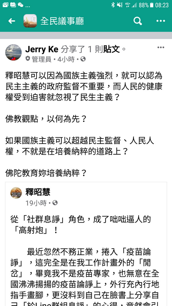 「釋昭慧可以因為國族主義強烈,就可以認為民主主義的政府監督不重要,而人民的健康權受到迫害就忽視了民生主義?