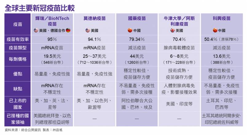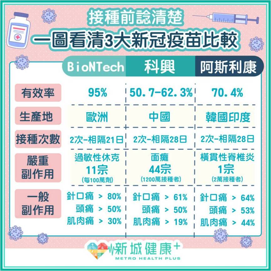 「香港政府向三間廠商預購新冠疫苗,雖然科興疫苗已到港,但市民依然對接種疫苗一事心存疑問。以下有三種新冠疫苗詳細數據(圖一),請參閱之。