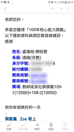 剛打開我的信箱,教發中心懿鳳來函告知,由於我獲得「109年核心能力獎勵」,獎項是「教師成長社群獎勵」。109-1(12000)+108-2(10000),教發已匯款22000元獎金給我。