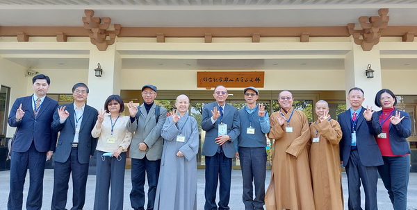近午的訪視教學設施時段,南華大學林聰明校長特邀訪視委員到新建完成的「百萬人興學中心」参訪。参訪結束時,於該中心大門口與禪堂前,校長(中)、宗教所教師們與訪視委員合影留念。