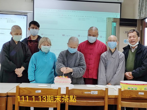 由於這是本學期最後一堂課,因此哈辛仁波切(右三)特別購買素糕,玟櫻(戴口罩左三)則為大家沖泡可可,我們快樂地同步轉起法輪與食輪。