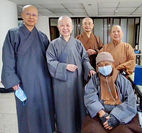 我端詳坐在輪椅上的融慎法師,感覺她氣色甚好,臉頰也比前年豐潤了一些。雖然不太能言語,但是她見到我們,歡喜之情莫能遏抑。法明法師告知:她目前是類巴金森病,所以言語、行動功能都已受損,但她依然正念分明,並且勤於聆聽我說法的影音。聞其精進如此,再加上有印籍看護阿帝悉心照護,這就讓我放心不少,且對法明法師與道友們的慈悲覆護,感激莫名。