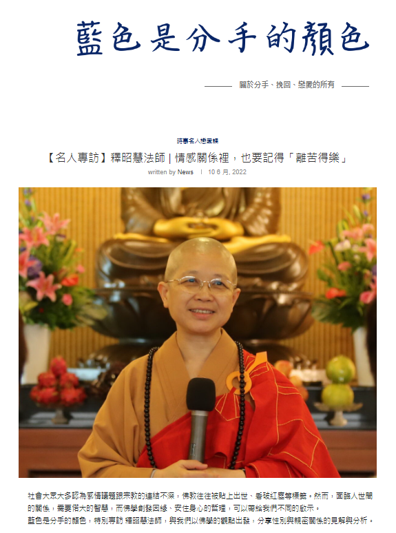 藍色是分手的顏色,特別專訪 釋昭慧法師,與我們以佛學的觀點出發,分享性別與親密關係的見解與分析。