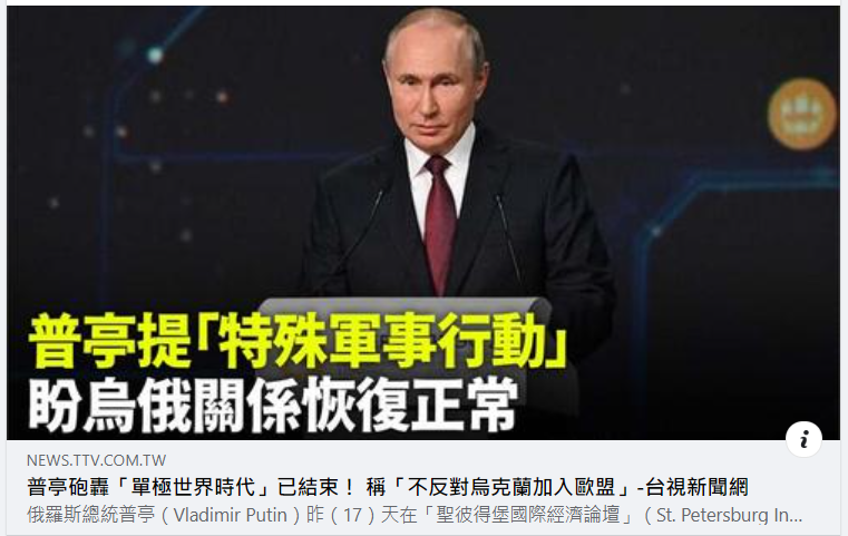 【摘錄新聞】 TTV NEWS https://news.ttv.com.tw/news/11106180000300W 普亭砲轟「單極世界時代」已結束! 稱「不反對烏克蘭加入歐盟」 2022.06.18 07:58
