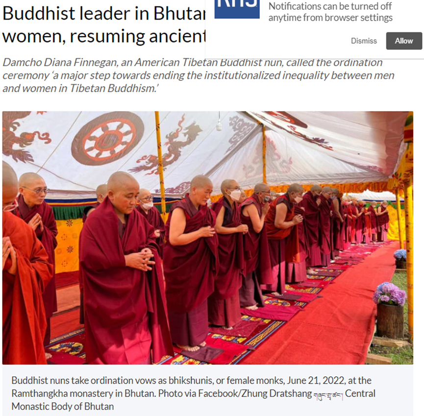 https://religionnews.com/2022/06/21/buddhist-leader-in-bhutan-fully-ordains-144-women-resuming-ancient-tradition/?fbclid=IwAR19d0yQF5DmnEHlZNqnk4felbJe0ZxjMPV2Dsiq2GxoO0LXbOoPfdqy9dg&fs=e&s=cl