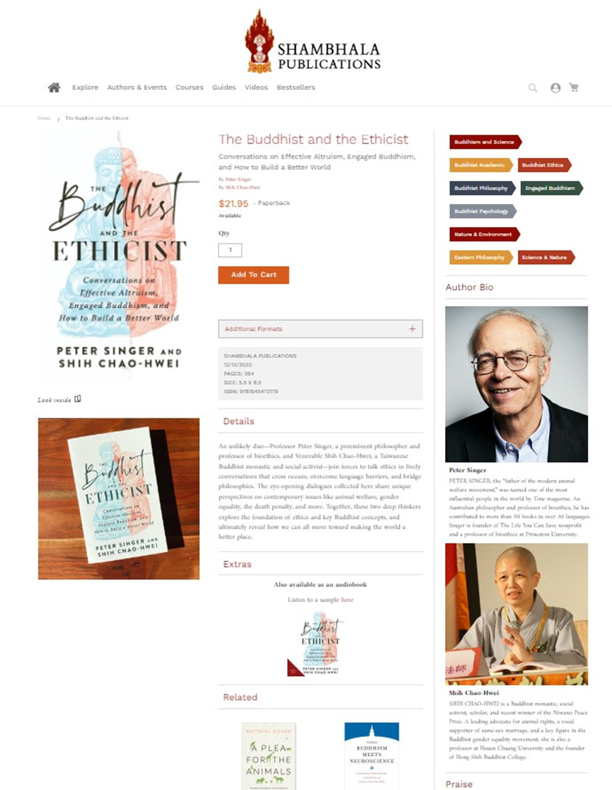 美國Shambala出版社的首頁,已於12月12日將The Buddhist and the Ethicist(《佛教徒與倫理學家》,Peter Singer教授與我合寫的英文版新書)正式上架了。