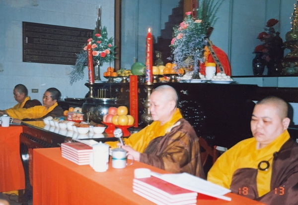 勝慧法師(右二)於誦經拜懺時,總是受到守性法師的禮遇而擔任中尊。(圓凱法師提供)