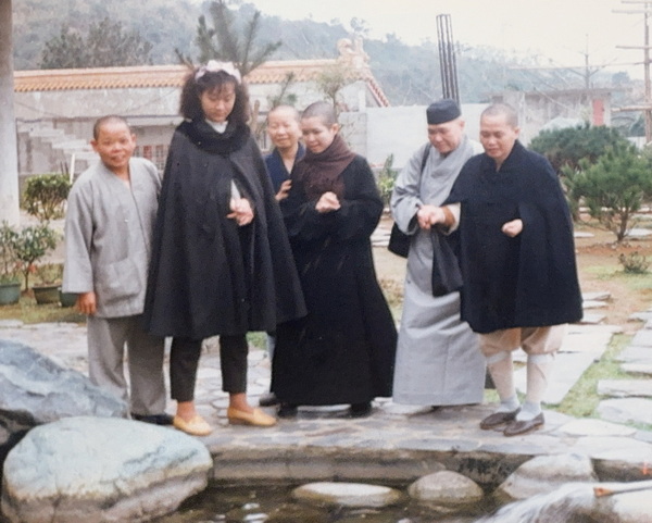 勝慧法師(右)、玲文美眉(左)與本人(左二)(同上址,時間、地點不詳)。(圓凱法師提供)