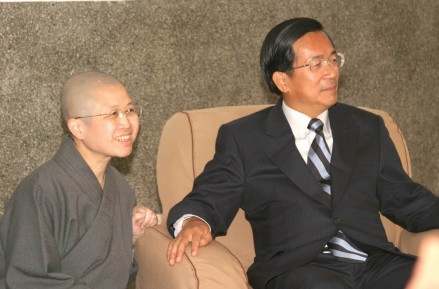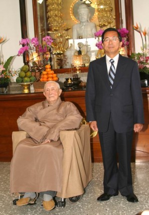 江燦騰教授並不死心,三年來,他對筆者催促了好幾次,甚至極力說服筆者,不要從「導師需不需要獎章殊榮」的角度,而要從「國家應不應該表彰國寶」的角度,來思考此事的意義。也因此,遲至去年七月二十三日,在客委會葉菊蘭主委與郭榮宗立委造訪之時,筆者方纔提起頒贈國家獎章之議。葉主委非常積極,回台北後,立刻向陳總統報告此事,總統乃請一向與佛教界感情深厚的勞委會主委陳菊,與中華佛寺協會林蓉芝秘書長作後續之聯繫,並選在導師百歲嵩壽之前,親自蒞臨華雨精舍,向導師頒授勳章。