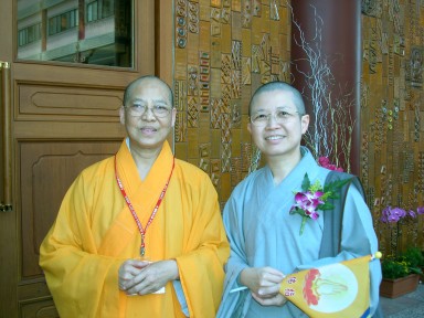 90.2.26.瞻禮佛指舍利,昭慧法師與金光明寺住持慈容法師 合影於大殿前。 如果台聯將炮口鎖定中共,筆者將不予置喙,偏是他們竟然以此大作文章云:「台灣人……不應該再盲目、盲從、迷信與迷失,一個有自信的民族不必去取經,一個有自尊心的民族不必盲目崇拜,一個有根的民族就應該建立自己的文化,不要讓台灣人民六神無主……大家一起來拒絕中共的……宗教統戰。」如此發言,業已失去了作為一個政黨所應嚴守的「政教分際」。