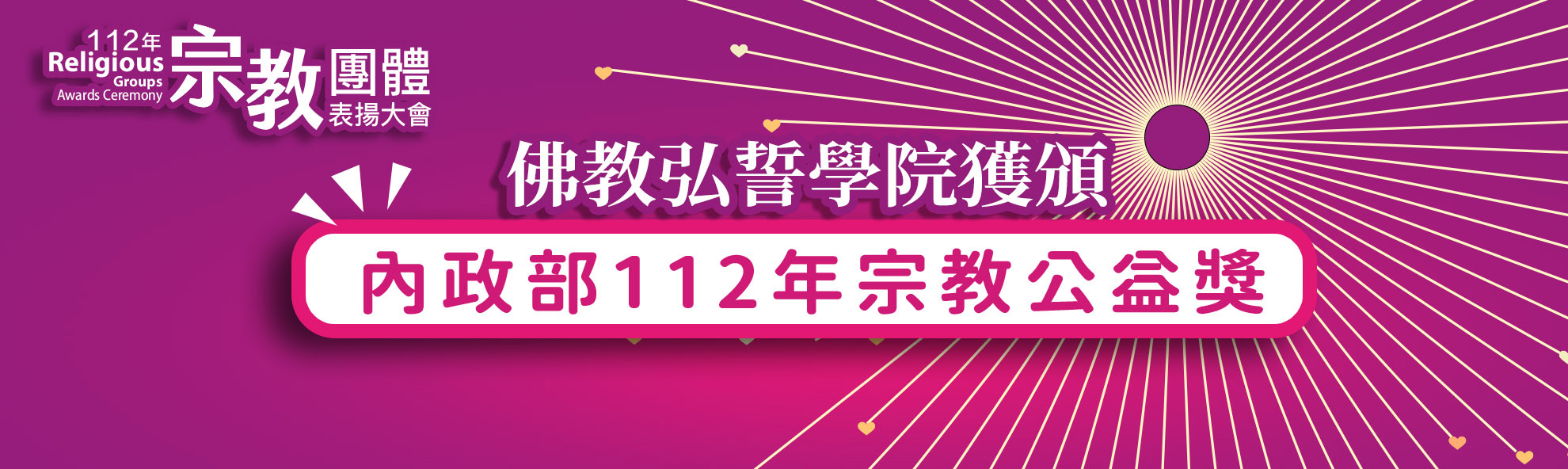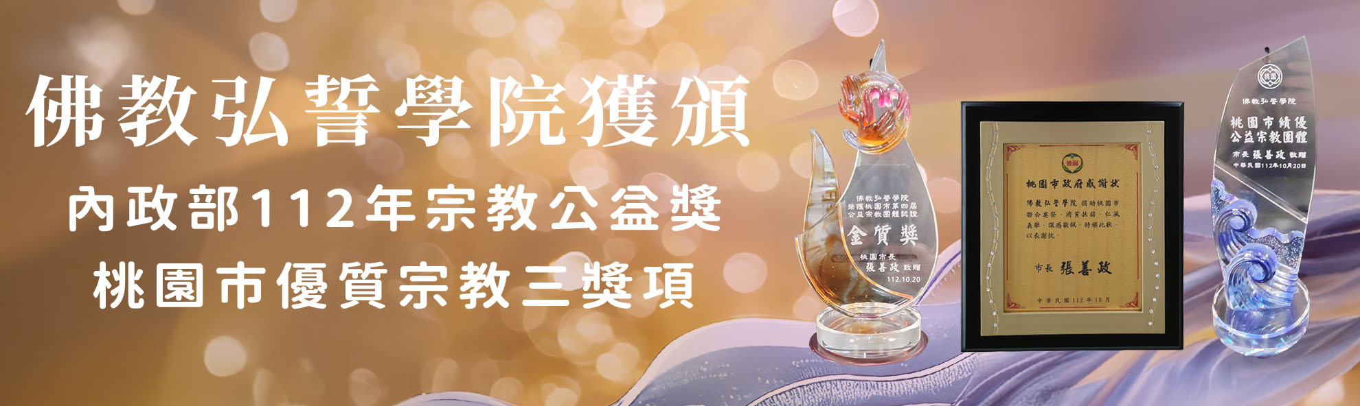 內政部於112年8月25日舉辦宗教團體表揚大會,本院榮獲「宗教公益獎」,由住持心皓法師、監院心謙法師代表學院參與大會領獎。本年度計有161個宗教團體獲頒宗教公益獎,13個宗教團體獲頒宗教公益深耕獎,由内政部林右昌部長頒發獎牌。