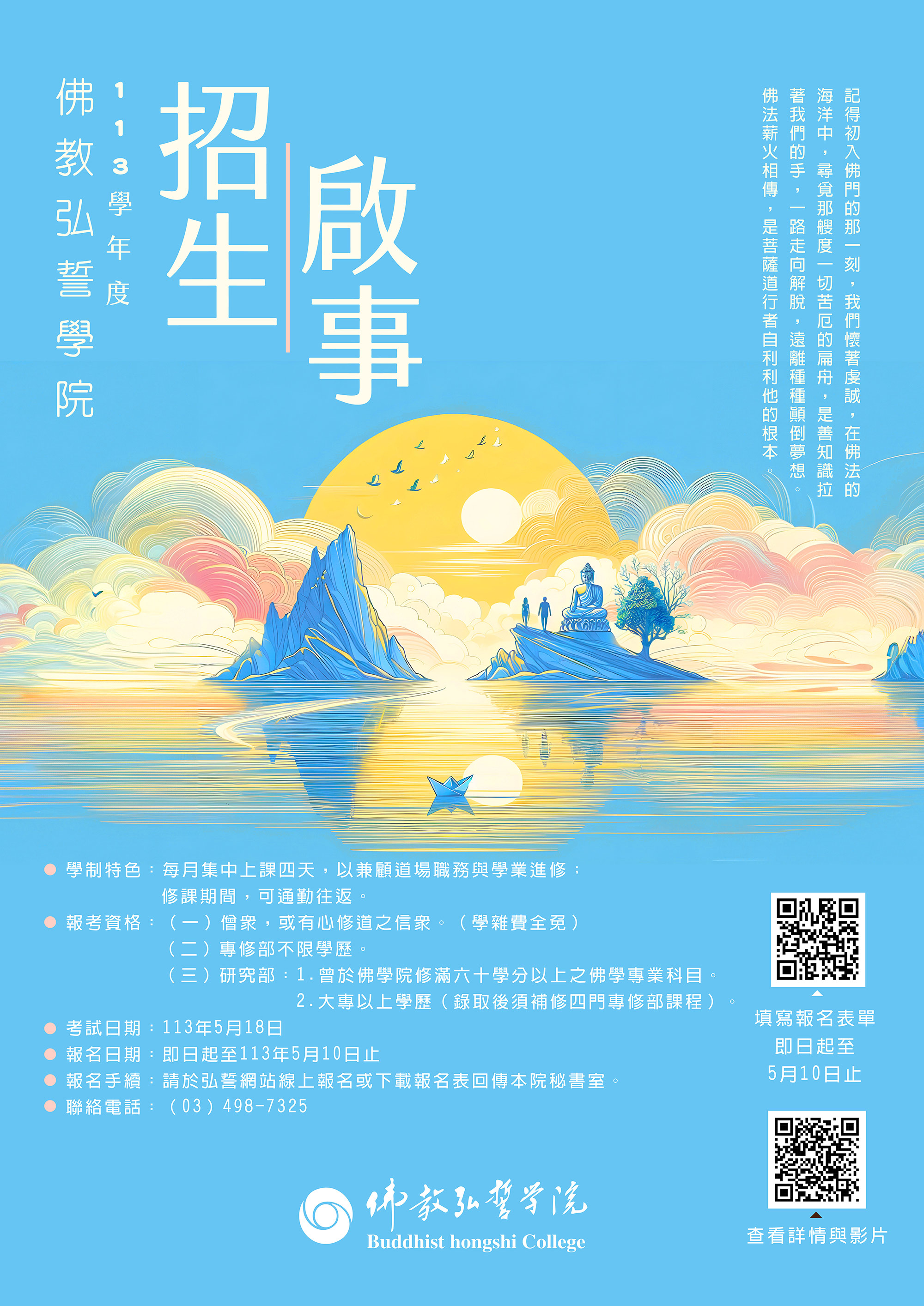 線上報名者請將600字以上自傳以e-mail傳遞,並儘速另行郵寄學歷證件影本、佛學院成績單影本(研究部)、最近兩吋照片2張。郵寄佛教弘誓學院秘書室: 地 址:328010桃園市觀音區新富路一段622巷28號 電 話:(03)498-7325 傳真:(03)498-6123 網址:www.hongshi.org.tw Email:hong.shi@msa.hinet.net